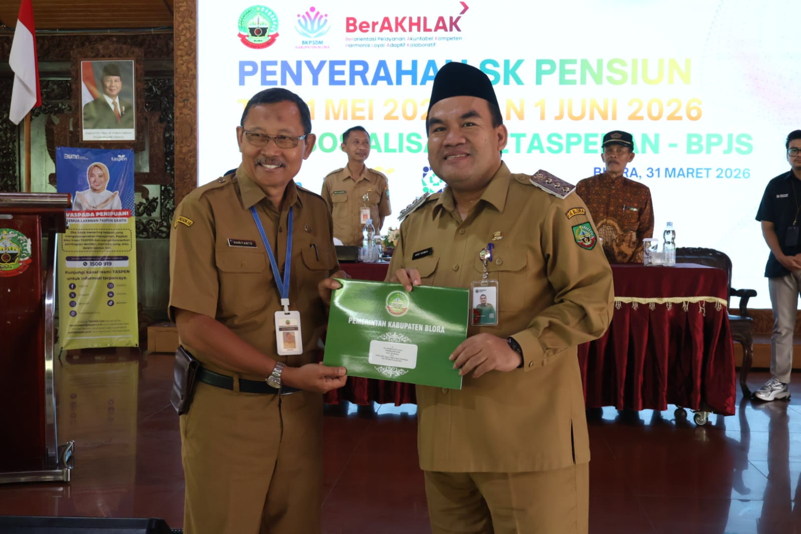 BuseronlineNews.com // Blora – Bupati Blora, Dr. H. Arief Rohman, menyerahkan Surat Keputusan (SK) Pensiun kepada 70 Aparatur Sipil Negara (ASN) di lingkungan Pemerintah Kabupaten Blora Jawa Tengah pada Selasa (31/3/2026) di Pendopo Rumah Dinas Bupati Blora.