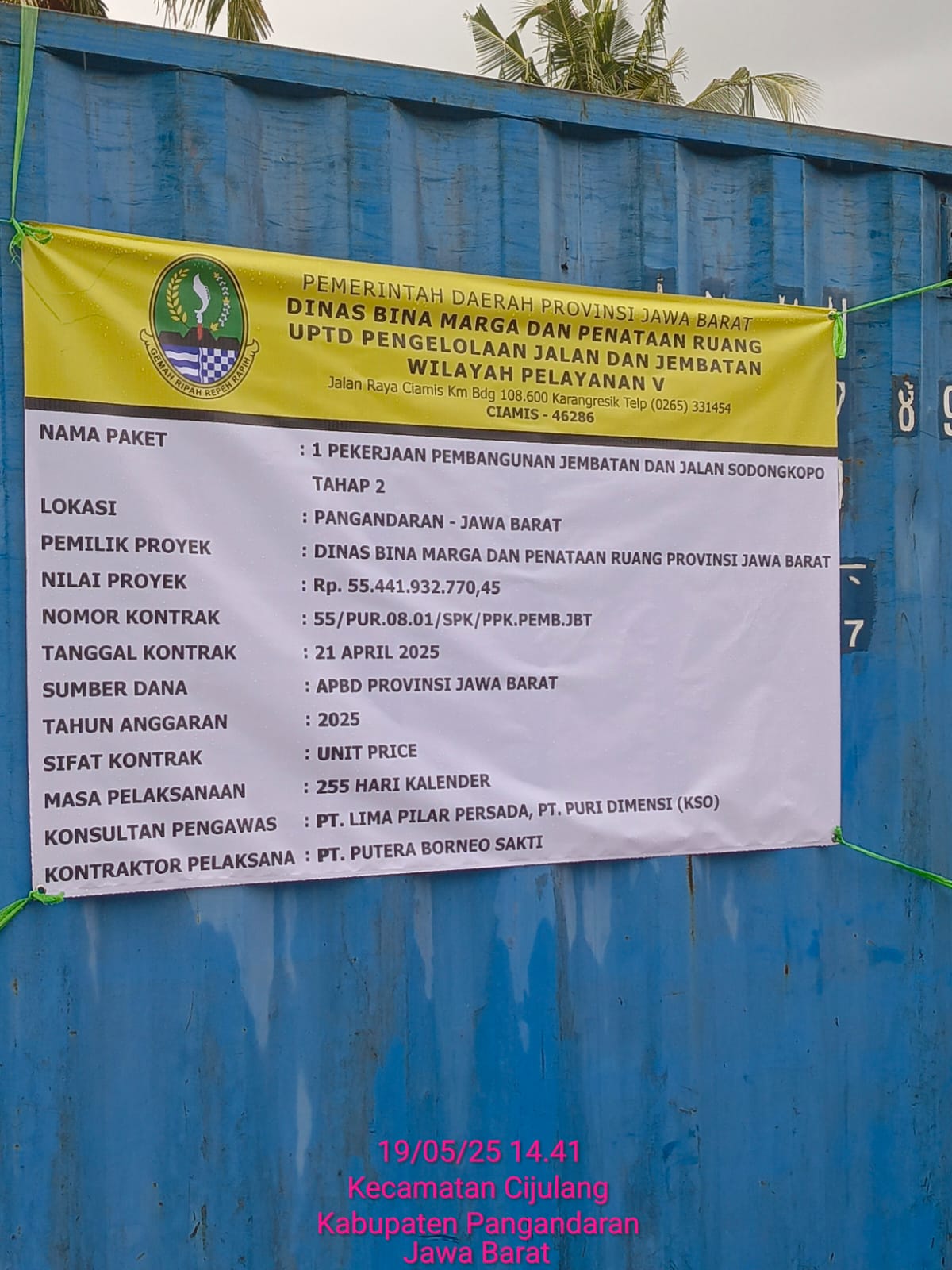 Dalam laman LPSE Jawa Barat, jumlah peserta penyedia jasa yang berminat untuk mengerjakan Pekerjaan Pembangunan Jembatan dan Jalan Sodongkopo Tahap 2 sebanyak 119 peserta dan dimenangkan PT. PUTERA BORNEO SAKTI yang beralamat Jl. Pematang Panjang Km.04 Rt.21 Kel/Desa Gambut, Kec.Gambut Kab.Banjar – Banjar (Kab.) – Kalimantan Selatan dengan nilai penawaran Rp. 55.441.932.770,46 dari HPS Rp. 56.611.314.999,08 atau 97,93 %.