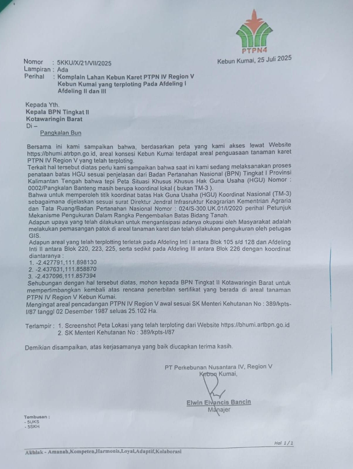 Surat tertanggal 13 April 2026 tersebut baru saja diterimanya setelah maraknya sorotan pemberitaan mengenai dugaan PTPN IV Regional V Kebun Kumai yang memiliki kebun karet di luar Hak Guna Usaha (HGU), yang berujung pada sengketa pertanahan dengan warga Desa Pangkalan Banteng.