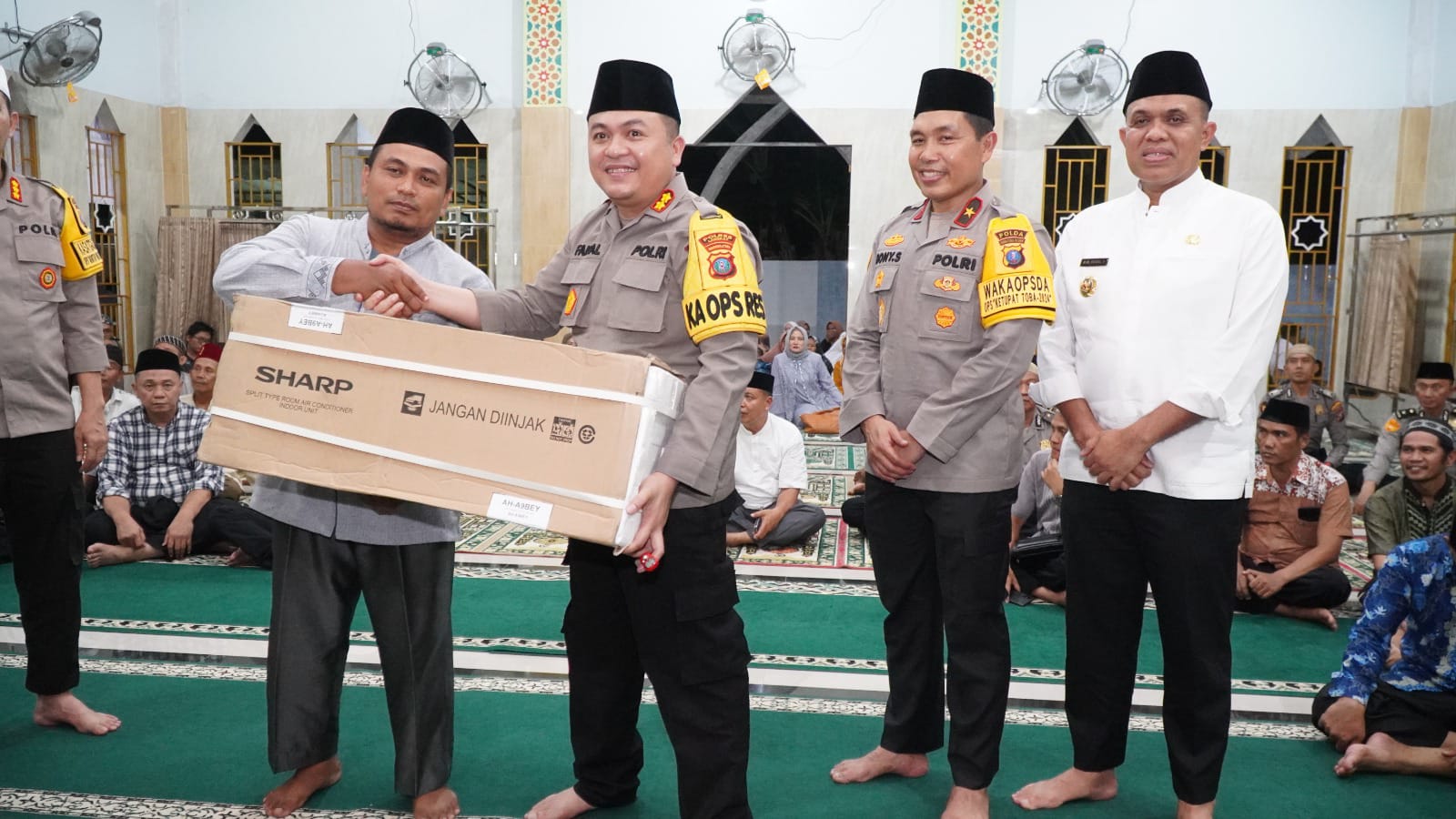 Selanjutnya Pemberian tali asih berupa sembako dan 4 unit AC kepada BKM Masjid Al-Ikhlas oleh Wakapolda Sumut dan Tim Safari Ramadhan Sumatera Utara.