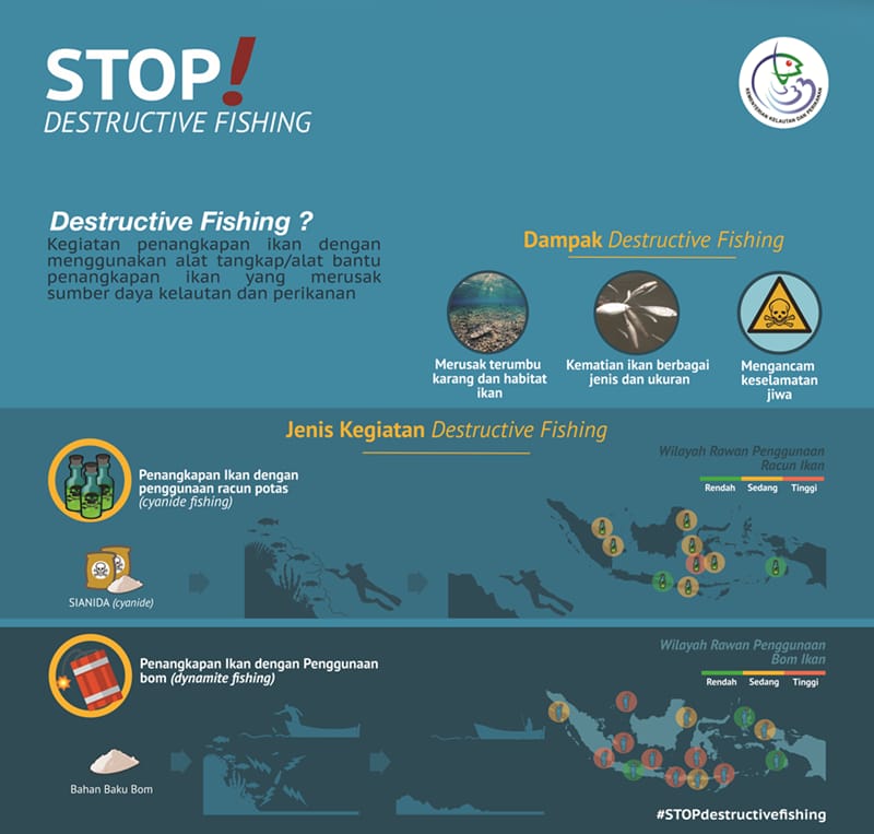 Dalam hal pengawasan kegiatan destructive fishing, Direktorat Jenderal PSDKP melalui para Pengawas Perikanan yang tersebar di seluruh Indonesia telah berhasil menggagalkan kegiatan penggunaan Bom Ikan. Keberhasilan terbaru dilakukan oleh Pangkalan PSDKP Tual yang menggagalkan penangkapan dengan bom ikan di perairan Tual Maluku pada bulan Maret 2017. Selanjutnya pada tanggal 10 April 2017 Dinas Kelautan dan Perikanan Provinsin Tenggara Barat bersama TNI Angkatan Laut ejuga berhasil menggagalkan penangkapan ikan dengan menggunakan bom ikan di perairan Lombok Timur. Sementara pada tanggal 30 Mei 2017, Polair Polda Sulawesi Selatan juga menangkap pelaku penangkapan ikan menggunakan bom ikan di perairan Barang Lombok, Sulawesi Selatan. Sementara itu, berdasarkan Undang-Undang Nomor 45 Tahun 2009 tentang Perubahan Atas Undang-Undang Nomor 31 Tahun 2004 tentang Perikanan menyebutkan bahwa setiap orang dilarang memiliki, menguasai, membawa, dan atau menggunakan alat Penangkap Ikan dan atau alat bantu penangkapan ikan yang mengganggu dan merusak keberlanjutan sumber daya ikan di kapal penangkap ikan di wilayah pengelolan Perikanan Republik Indonesia. Apabila diketahui dan didapatkan cukup bukti terdapat oknum masyarakat yang melakukan kegiatan penangkapan ikan dengan cara merusak, maka dapat dikenakan sanksi pidana penjara paling lama 5 tahun atau denda paling banyak Rp. 2 Miliar.