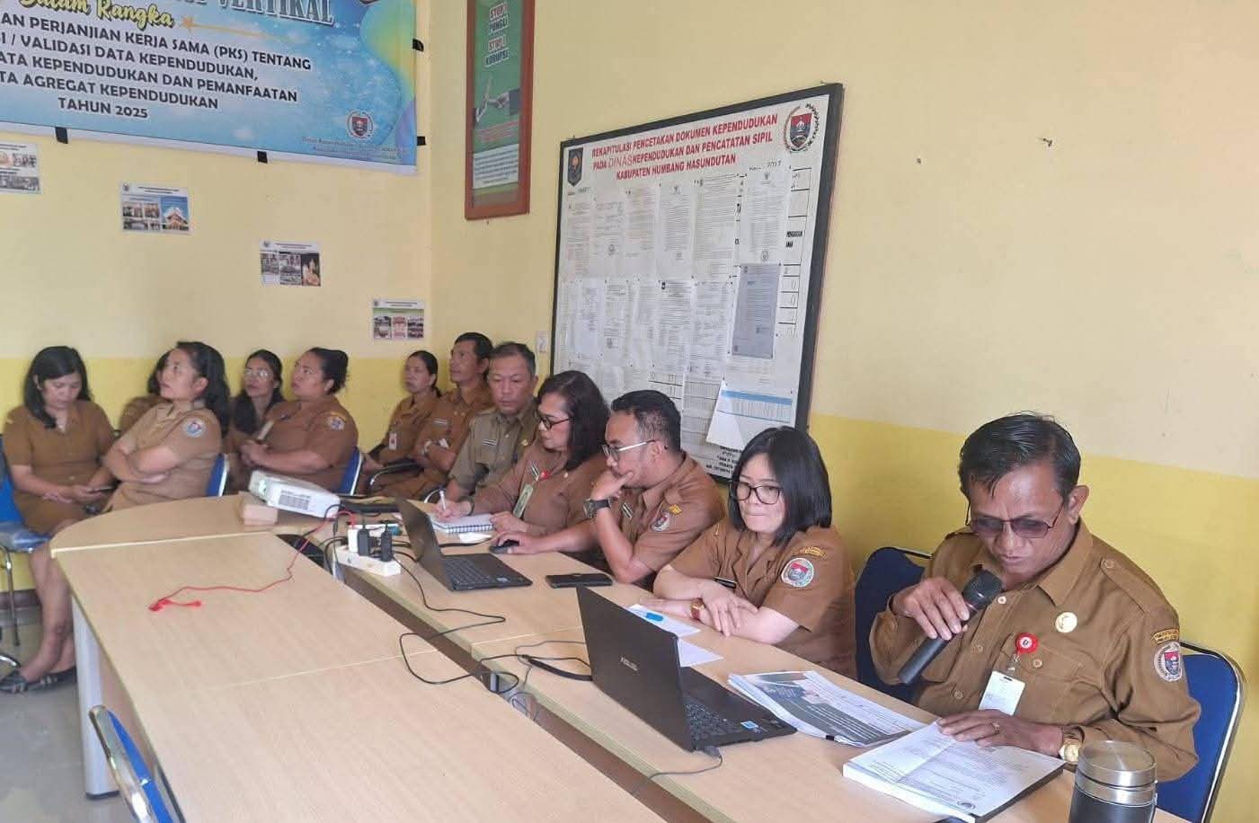 Kegiatan sosialisasi ini dilaksanakan Senin, 9 Maret 2026 secara daring dan diikuti oleh seluruh staf Dukcapil, para Kepala Seksi Pemerintahan Kecamatan, kelurahan, serta perwakilan dari 153 desa se-Kabupaten Humbang Hasundutan.