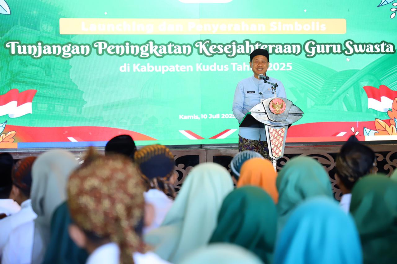 KUDUS – Komitmen Pemerintah Kabupaten Kudus dalam meningkatkan kualitas pendidikan dan kesejahteraan para pendidik terus ditunjukkan secara nyata. Bupati Kudus Sam’ani Intakoris secara resmi meluncurkan program Honorarium Kesejahteraan Guru Swasta (HKGS) Tahun 2025 dan menyerahkan bantuan secara simbolis kepada para penerima di Pendapa Kabupaten Kudus, Kamis (10/7/2025).