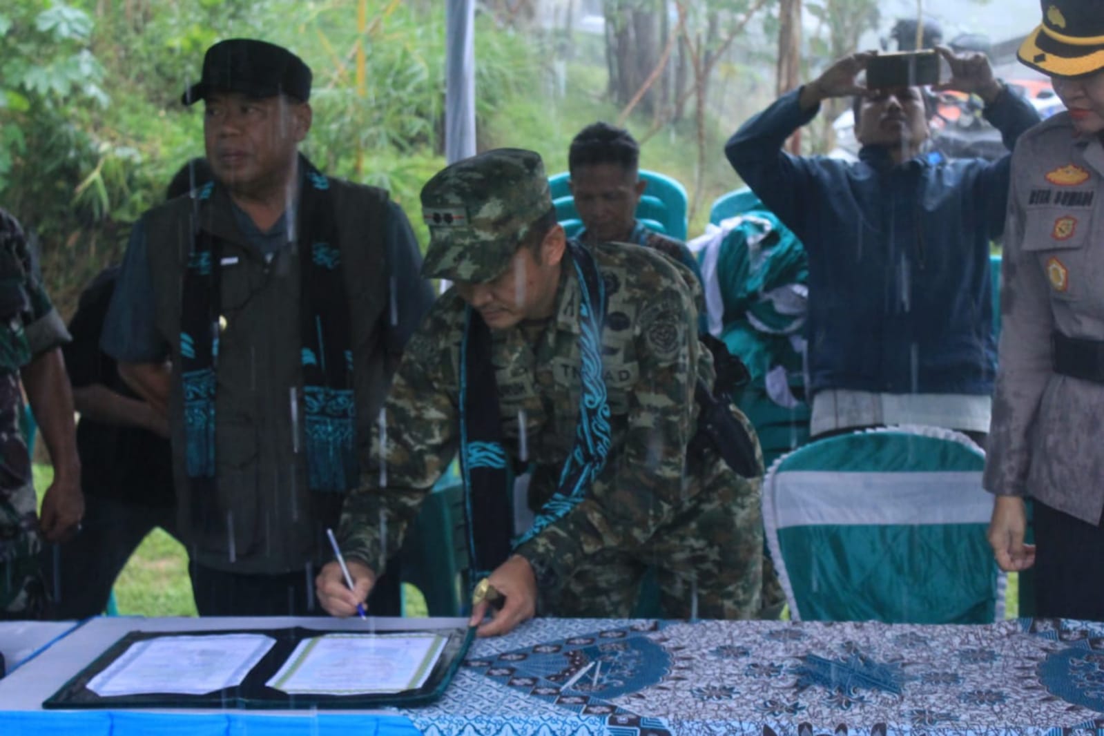 Pada kesempatan tersebut Bupati didampingi Dandim menyematan tanda peserta dan penyerahan alat kerja secara simbolis kepada perwakilan.