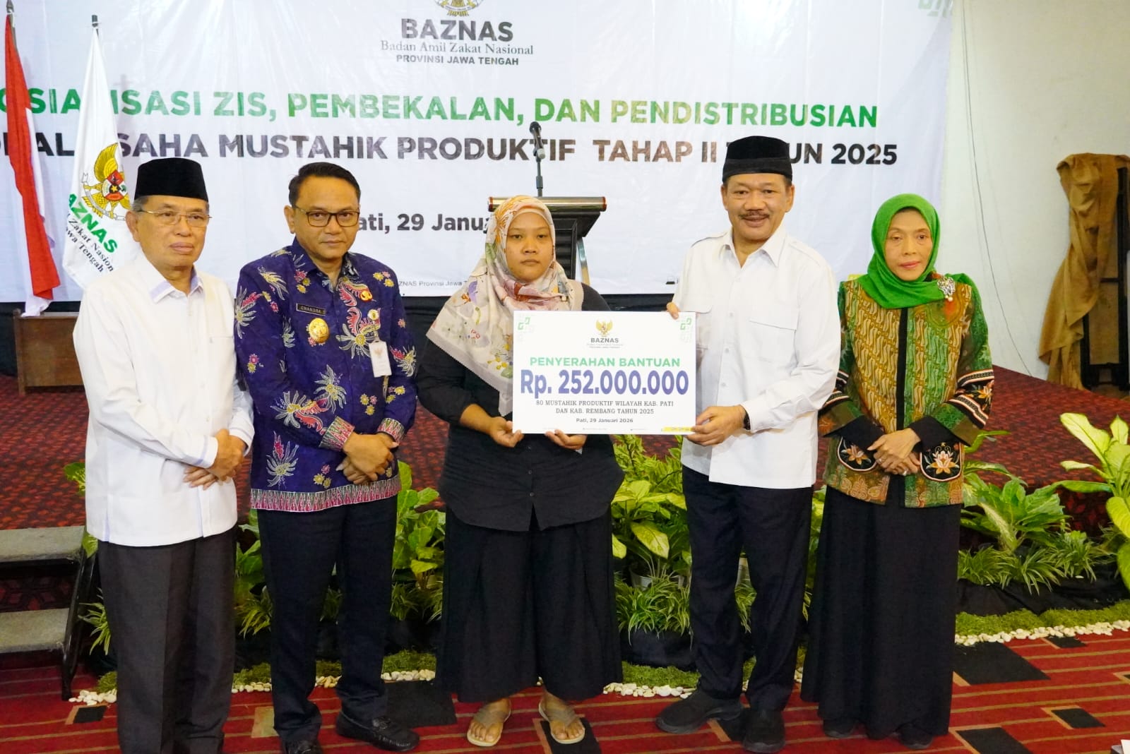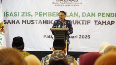 PATI — Plt. Bupati Pati, Risma Ardhi Chandra, menghadiri pembukaan acara Penyerahan Bantuan Modal Usaha bagi UMKM binaan Baznas Provinsi Jawa Tengah yang digelar di Hotel Safin Pati, Kamis (29/1/2026).