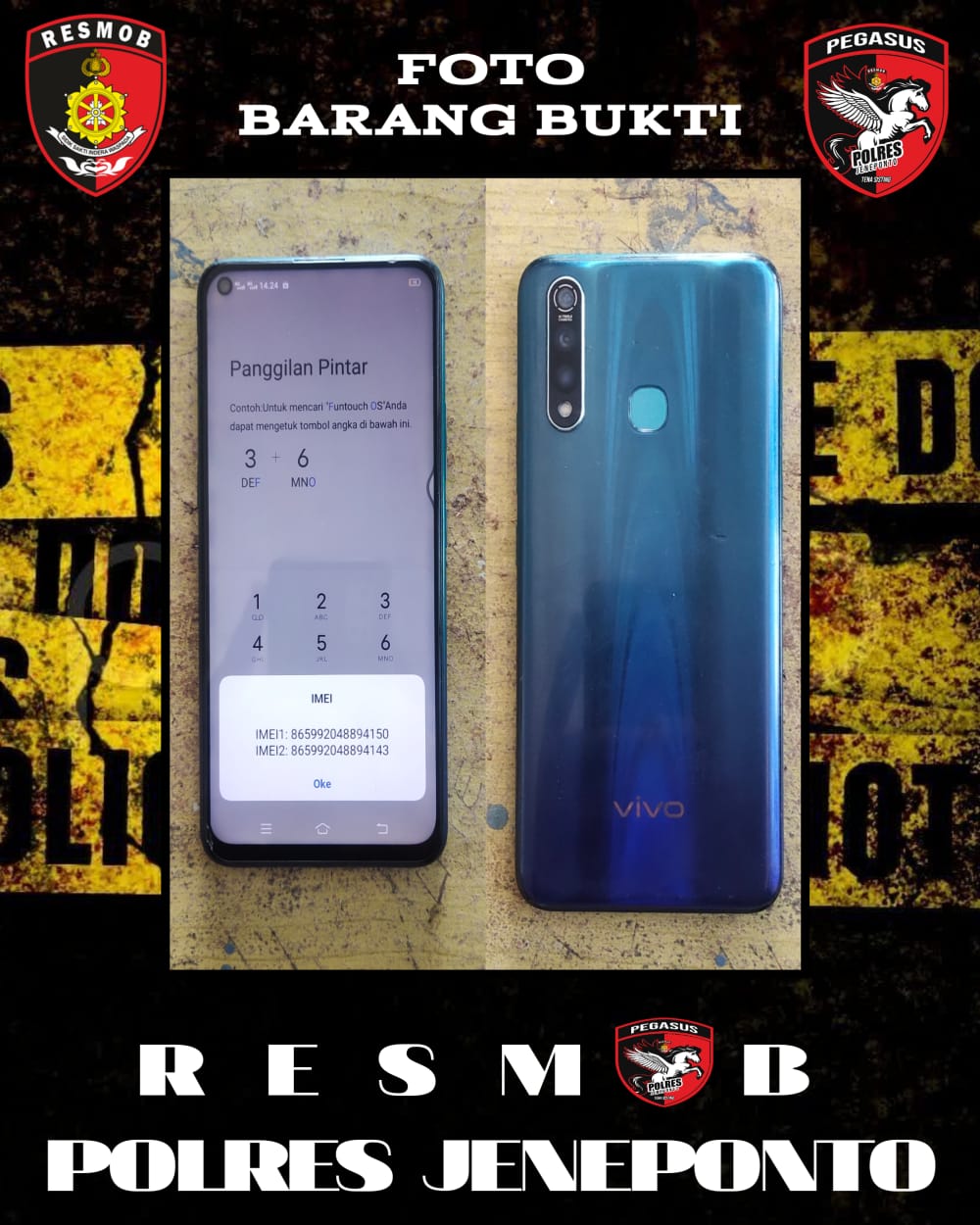 1 unit handphone Oppo A12 (IMEI 861082051394639 & 861082051394621)