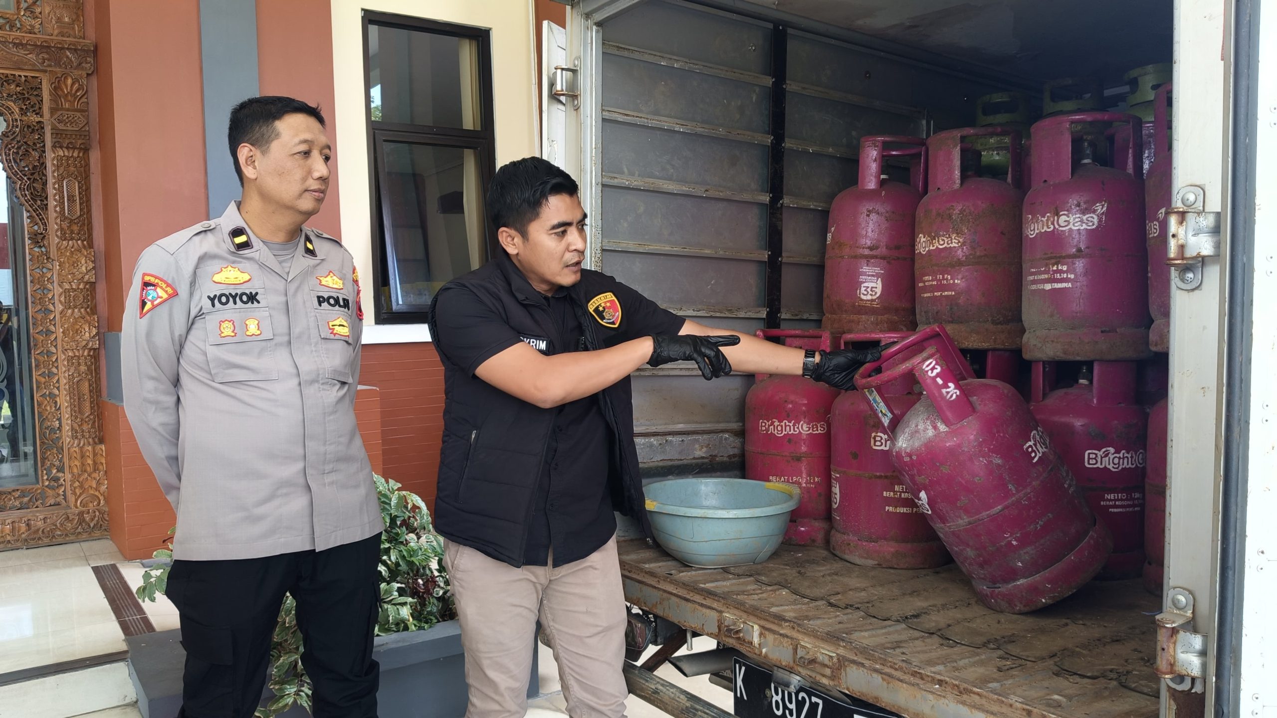 Barang bukti yang diamankan antara lain delapan alat suntik gas, satu buku catatan transaksi, satu bungkus plastik segel, satu timbangan elektronik, dua unit kipas angin, 20 tabung LPG 12 kilogram, serta 100 tabung LPG 3 kilogram bersubsidi.