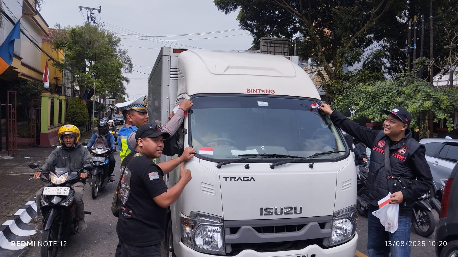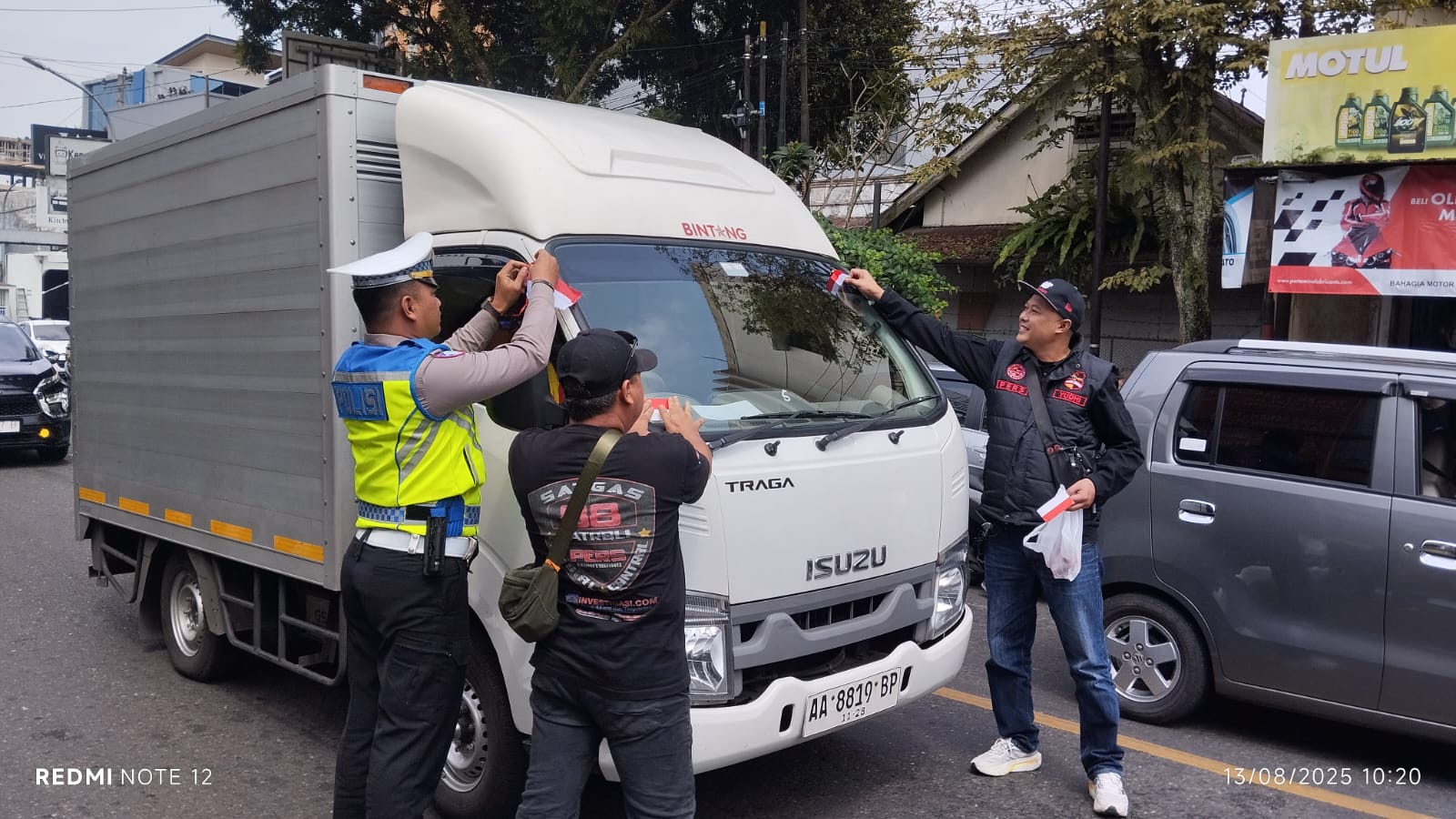 Masyarakat yang melintas tampak antusias menerima bendera dan banyak yang langsung memasangnya di kendaraan masing-masing. Suasana penuh semangat dan keakraban turut mewarnai kegiatan tersebut, menandai sinergi yang kuat antara media, aparat, dan masyarakat.