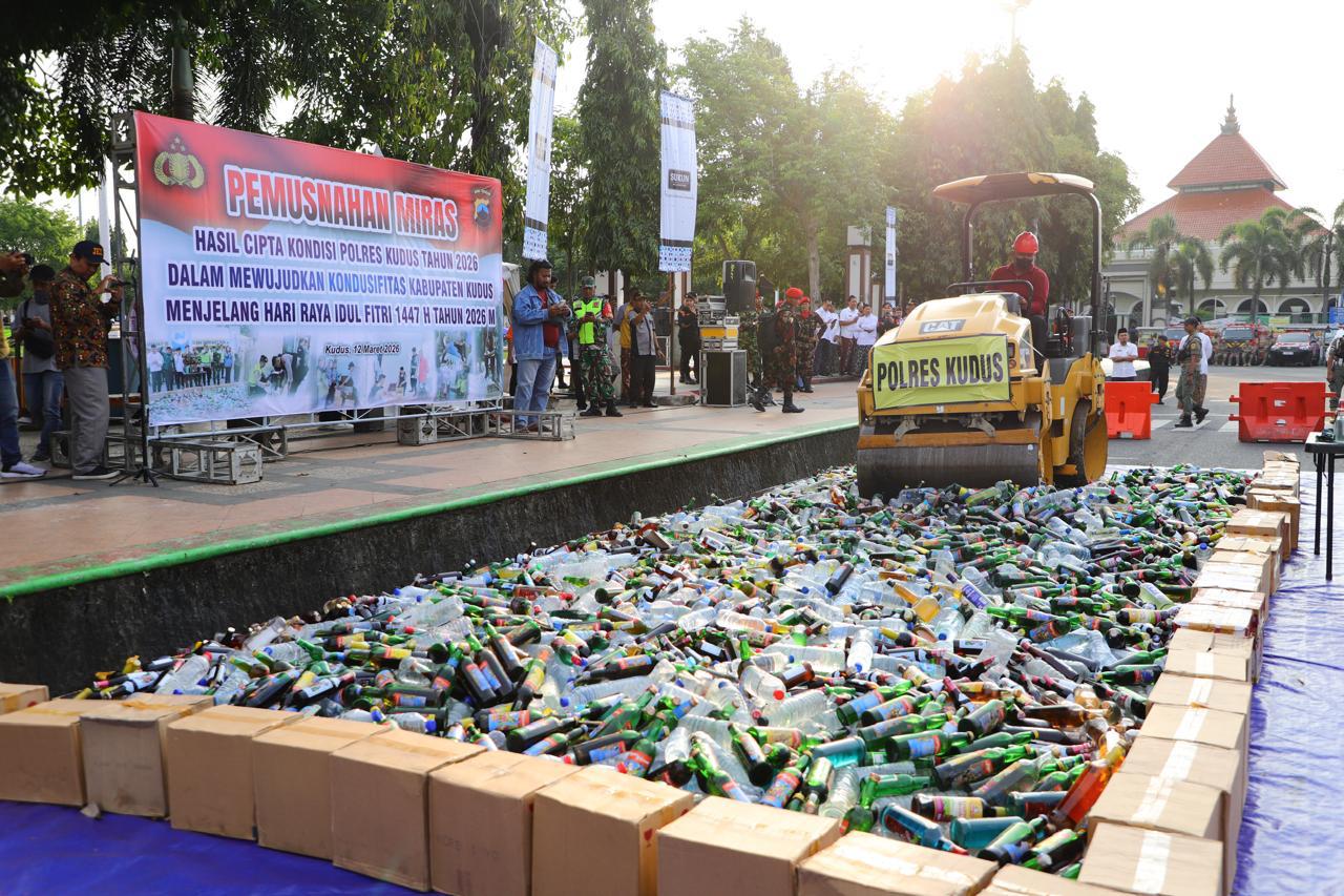 KUDUS – Polres Kudus memusnahkan ribuan botol minuman keras (miras) hasil razia yang dilakukan dalam kegiatan Kegiatan Rutin Yang Ditingkatkan (KRYD) serta operasi penyakit masyarakat selama hampir satu bulan terakhir.