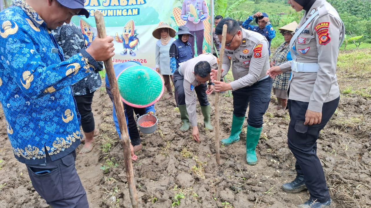 KUNINGAN —, Tugas polisi lalu lintas (polantas) tidak melulu soal mengatur arus kendaraan di jalan raya. Jajaran Satuan Lalu Lintas (Satlantas) Polres Kuningan membuktikan peran sosialnya dengan terjun langsung ke sawah, menanam jagung di lahan seluas 2 hektare di Desa Cibulan, Kecamatan Cidahu, Kamis (29/1/2026).