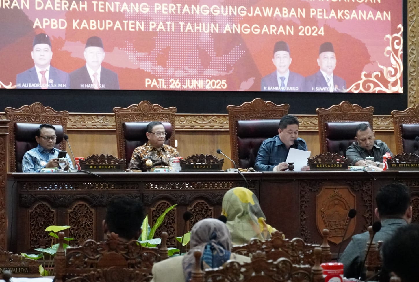 PATI – Bupati Pati Sudewo, Kamis (26/6/2025), menghadiri Rapat Paripurna dengan agenda Penyampaian Pandangan Umum Fraksi terhadap Rancangan Peraturan Daerah Tentang Pertanggungjawaban Pelaksanaan APBD Kabupaten Pati Tahun Anggaran 2024, di Ruang Paripurna DPRD.